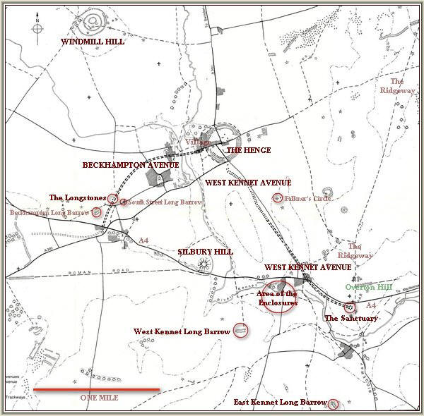 Although the map only highlights the well-known features of Avebury the whole area contains an abundance of lesser sites relating to the Neolithic and Bronze-Age periods. The Ridgeway which skirts the side of the Sanctuary was one of the main trade routes in the British Isles at that time. Without visiting the area it is difficult to fully appreciate the awesome scale of the monuments as they relate to the surrounding landscape.