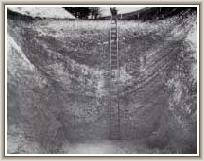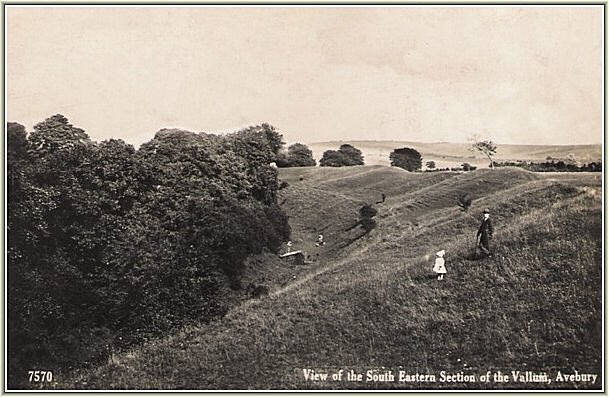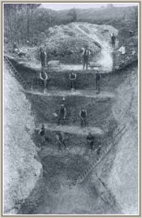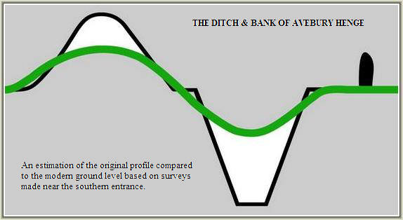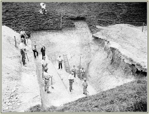 The ditch and bank formation that surrounds the Avebury Henge has to be one of the most amazing products of stone age engineering in the world. As can be seen from these early photographs taken when the ditch was being excavated near to the south entrance it originally was enormous...4,500 years worth of erosion and silting have reduced it to only a third of its original depth which was around 30 feet....Correspondingly the bank was considerably higher which has been estimated at between 20 to 25 feet. The distance from the bottom of the ditch to the crest of the bank could have therefore been a massive 55 feet in places. With a total length of over a kilometre it almost defies belief that the whole thing was dug out of solid chalk using such basic tools as antler picks and shovels made from ox shoulder blades. Nothing tells us more that the available labour at Avebury must have been considerable and capable of good organisation.