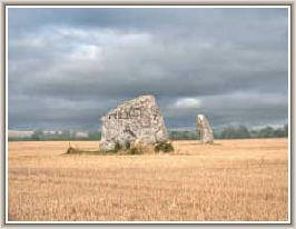 About a mile outside the main circle of the henge and on the line of the Beckhampton Avenue stand two large stones. With some interesting lichens adorning their surface they are known as the Longstones (also known locally as"Adam & Eve"). The larger of them, according to a drawing made by William Stukeley, is the surviving component of a cove similar in structure to that in the north circle of the henge; the other belongs to the avenue. Recent excavations have confirmed the existence of this cove.