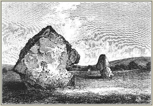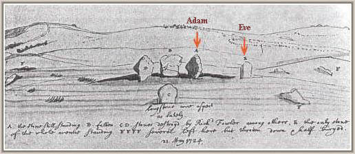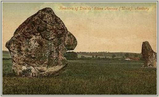 Of interest is this old postcard (believed to be early 1900's). It is very similar to the Colt Hoare drawing above and shows the massive "Adam" as being more upright and higher relative to ground level than it is now. The Cunnington restoration after its 1911collapse appears to have changed the stone's original aspect. It is suggested on the "Entrance Stones" page that the stones of the south entrance in the henge may have once appeared more like the "Swindon Stone"....These earlier images of "Adam" perhaps re-inforce that suggestion. It also causes one to consider whether the "female" component of the cove in the northern inner circle of the henge has now lost its original orientation.