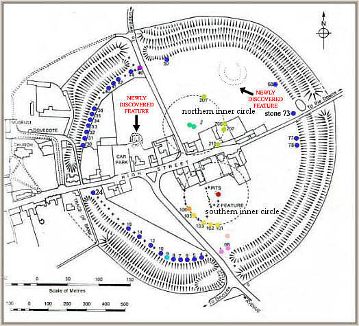 Two features within the henge have recently been discovered which await thorough investigation. These are now indicated on this plan. A survey at the end of 2003 has revealed that a number of stones remain buried around the eastern perimeter of the henge (see "The Marmalade Man").