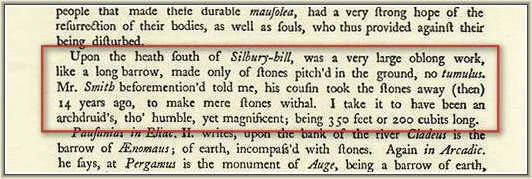 It wasn't only the stones of the henge, avenues and Sanctuary that fell victim to the desires of the local inhabitants. The demise of other megaliths in the area are mentioned by Stukeley in his book. An example of a substantial feature which has now vanished is mentioned in the extract shown below....It seems likely that many others have disappeared which weren't brought to the attention of Stukeley and a true picture of what once existed in the Avebury area will never be recovered with any certainty.