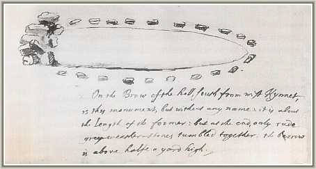 John Aubrey's (supposed) sketch of the West Kennet Long Barrow interestingly shows it as being surrounded by stones. Stukeley doesn't seem to have made any reference to these kerb stones(peristalith) and recent researchers now doubt that Aubrey's drawing was in fact of West Kennet and is more likely to have been the 'South Downs' long barrow identified on a drawing by Stukeley. This barrow no longer survives but is thought to have been in Beckhampton Plantation.